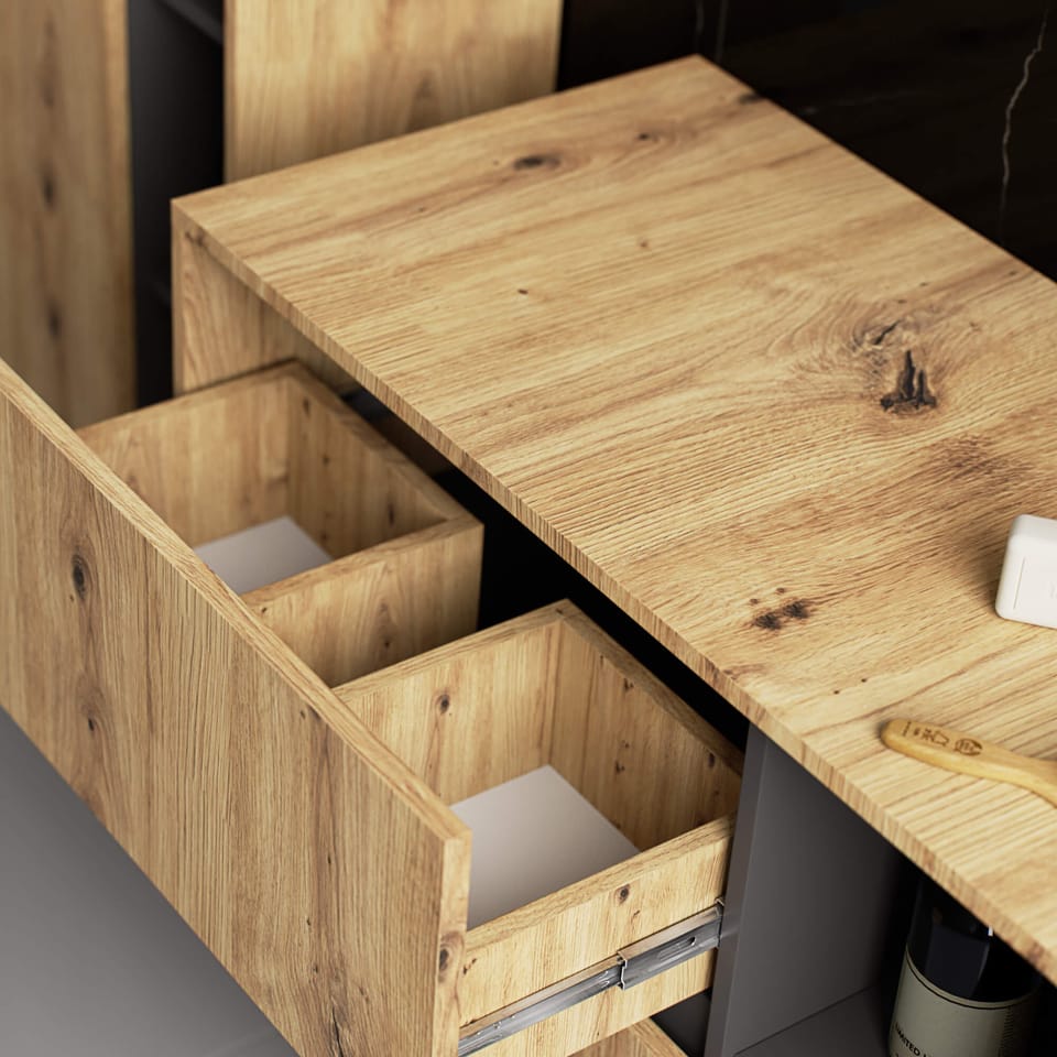 Nasze meble są wyprodukowane z płyty wiórowej laminowanej o grubości 16 mm. Dzięki temu są bardzo trwałe, wytrzymałe i odporne na wilgoć. Nie należy ich jednak narażać na długotrwały kontakt z wodą, która może prowadzić do puchnięcia i odkształcenia płyty. Szafki z szufladami zostały wyposażone w prowadnice kulkowe, które dbają o to, aby szuflady wysuwały się lekko i cicho.