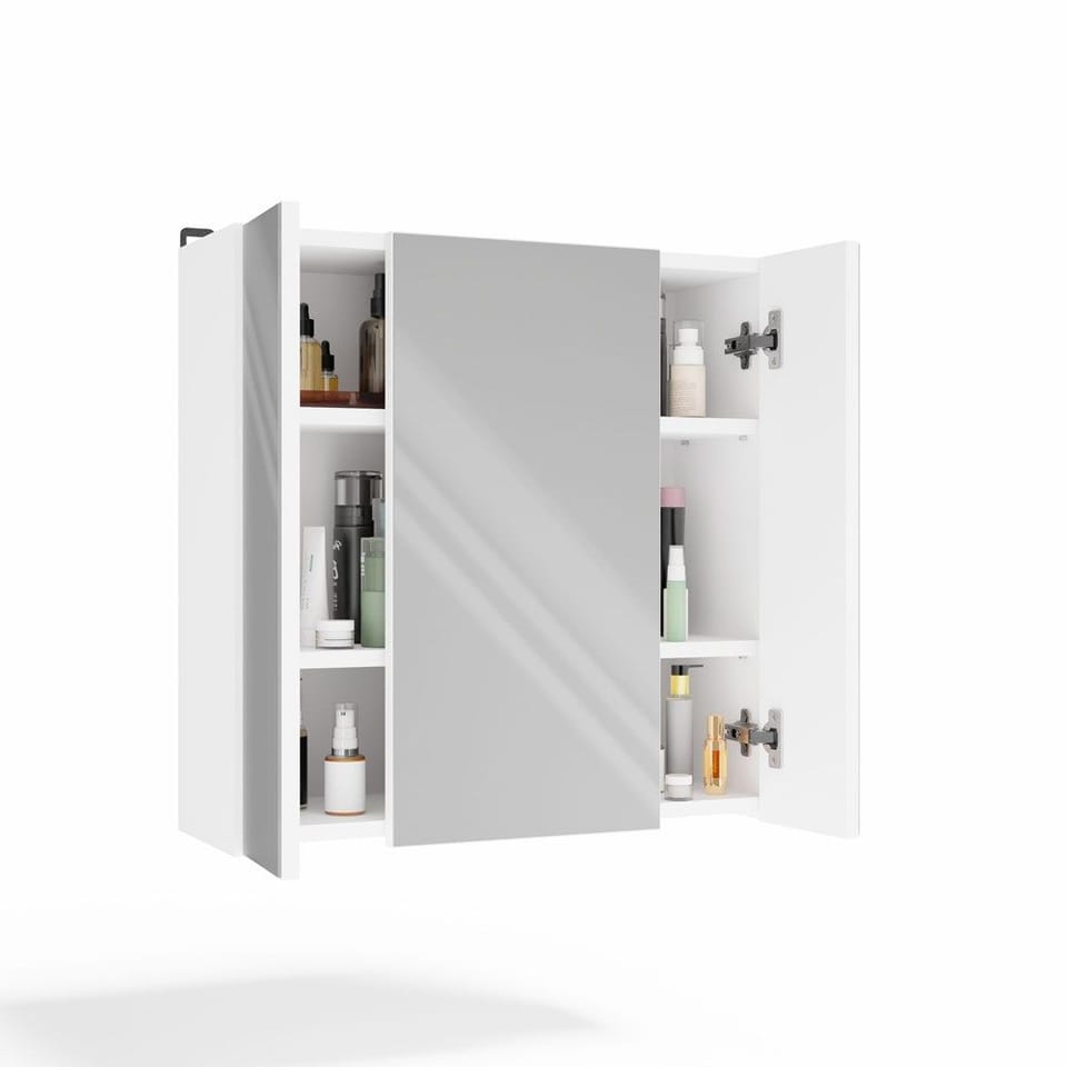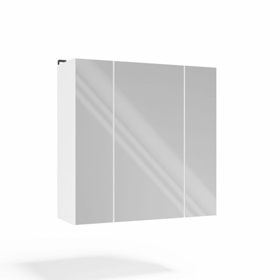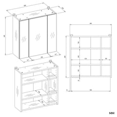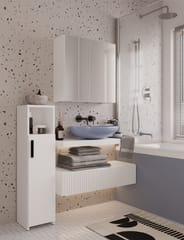 - Wyposażona w 6 praktycznych półek schowanych za stylowymi drzwiczkami z lustrzanym frontem.