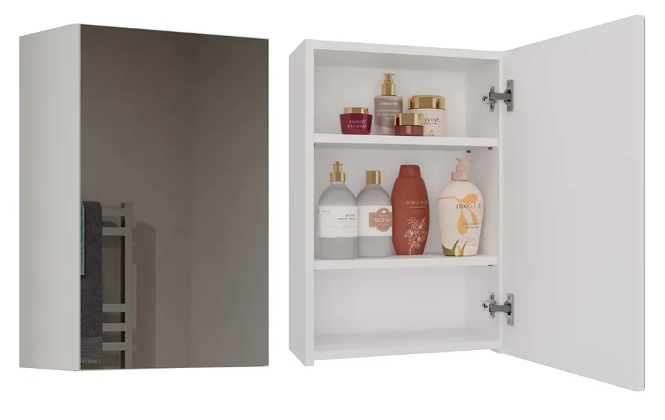 WYMIARY: Szerokość: 40 cm Wysokość: 60 cm Głębokość: 22 cm MATERIAŁ: Wysokiej jakości płyta wiórowa laminowana o grubości 16 mm Front drzwi: Ozdobne szklane lustro Łatwe w czyszczeniu: Wystarczy miękka ściereczka, unikać silnych środków chemicznych. W opakowaniu: Instrukcja montażu wraz ze wszystkimi potrzebnymi akcesoriami montażowymi. Meble są fabrycznie zapakowane do samodzielnego montażu. Informacja:Dokładamy wszelkich starań, aby kolory mebli prezentowane na zdjęciach były odwzorowane możliwie jak najdokładniej. Należy jednak pamiętać, że ich odbiór może się różnić w zależności od indywidualnych ustawień monitora lub ekranu (takich jak jasność, kontrast, temperatura barwowa czy technologia wyświetlania). Rzeczywisty odcień produktu może się także różnić w zależności od warunków oświetleniowych. Ewentualne różnice kolorystyczne nie wynikają z wady produktu.