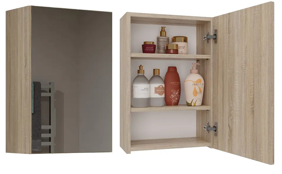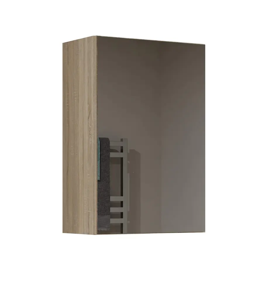 WYMIARY: Szerokość: 40 cm Wysokość: 60 cm Głębokość: 22 cm MATERIAŁ: Wysokiej jakości płyta wiórowa laminowana o grubości 16 mm Front drzwi: Ozdobne szklane lustro Łatwe w czyszczeniu: Wystarczy miękka ściereczka, unikać silnych środków chemicznych. W opakowaniu: Instrukcja montażu wraz ze wszystkimi potrzebnymi akcesoriami montażowymi. Meble są fabrycznie zapakowane do samodzielnego montażu. Informacja:Dokładamy wszelkich starań, aby kolory mebli prezentowane na zdjęciach były odwzorowane możliwie jak najdokładniej. Należy jednak pamiętać, że ich odbiór może się różnić w zależności od indywidualnych ustawień monitora lub ekranu (takich jak jasność, kontrast, temperatura barwowa czy technologia wyświetlania). Rzeczywisty odcień produktu może się także różnić w zależności od warunków oświetleniowych. Ewentualne różnice kolorystyczne nie wynikają z wady produktu.