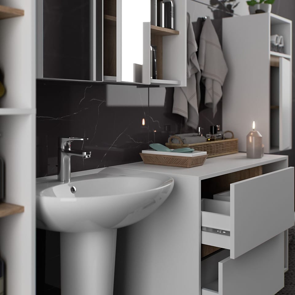 Nasze meble są wyprodukowane z płyty wiórowej laminowanej o grubości 16 mm. Dzięki temu są bardzo trwałe, wytrzymałe i odporne na wilgoć. Nie należy ich jednak narażać na długotrwały kontakt z wodą, która może prowadzić do puchnięcia i odkształcenia płyty. Szafki z szufladami zostały wyposażone w prowadnice kulkowe, które dbają o to, aby szuflady wysuwały się lekko i cicho.