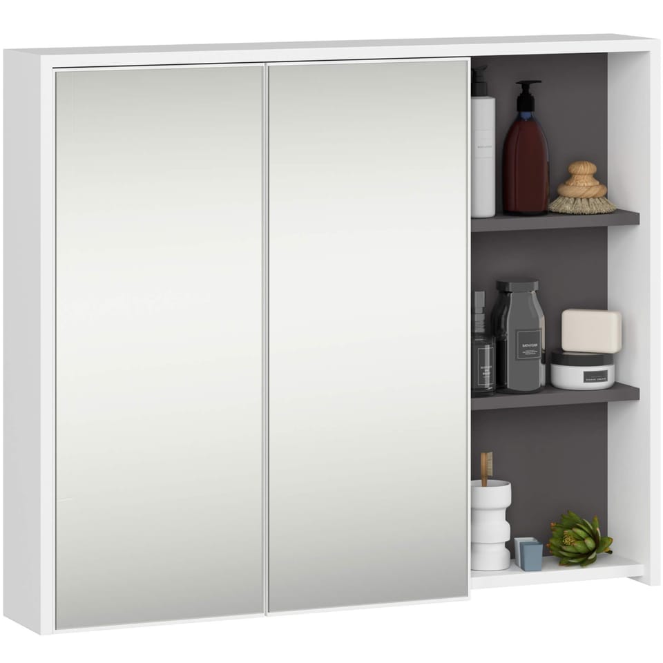 Szafka z lustrem do łazienki VAMI W90 dwudrzwiowa perfekcyjnie łączy wygodę i funkcjonalność z nowoczesną stylistyką. Umieszczone na obu drzwiach szafki lustro świetnie spełnia swoje zadanie przy codziennym makijażu bądź wieczornej pielęgnacji. We wnętrzu szafki znajdują się trzy półki na kosmetyki i drobne akcesoria. Dodatkowe trzy półki otwarte dodają produktowi walorów estetycznych, jak i użytkowych. Szafka z lustrem do łazienki VAMI W90 służy do montażu na ścianie. Mebel ma szerokość 90 cm, wysokość 75 cm i głębokość 15 cm. Do tego modelu idealnie pasuje szafka pod umywalkę nablatową VAMI W90.