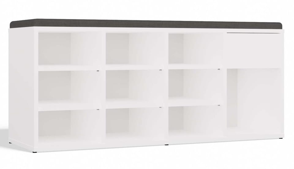 Szafka na buty TALLIN to funkcjonalne i estetyczne rozwiązanie do każdego przedpokoju, które łączy komfort siedzenia z dużą ilością miejsca do przechowywania. Biała bryła o lekkim, nowoczesnym wyglądzie została wzbogacona o tapicerowane siedzisko, zapewniając wygodę podczas zakładania obuwia. Mebel wyposażony został w aż 9 otwartych przegród na buty, szufladę na drobiazgi oraz wysoką komorę, w której z łatwością zmieścisz wyższe obuwie lub akcesoria.