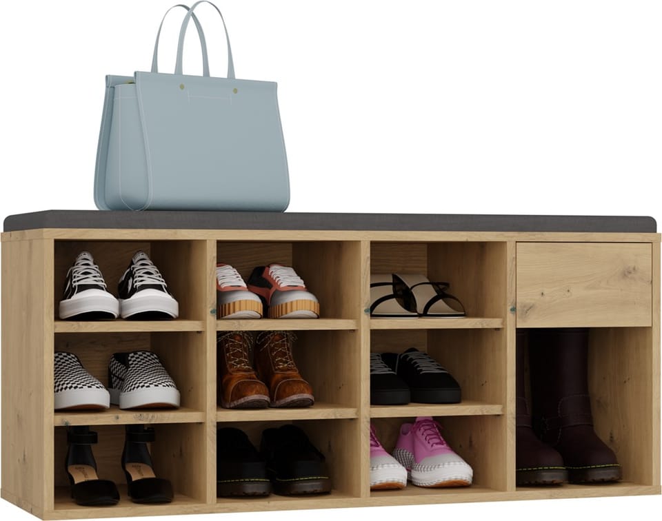 Szafka na buty TALLIN to praktyczny i stylowy mebel, który świetnie odnajdzie się w każdym przedpokoju. W wersji kolorystycznej dekoru dąb artisan prezentuje się elegancko i ciepło jednocześnie – pasując zarówno do nowoczesnych wnętrz, jak i tych w bardziej klasycznym stylu. Mebel łączy w sobie komfort siedzenia z funkcjonalną przestrzenią do przechowywania – posiada aż 9 przegród na buty, praktyczną szufladę na drobiazgi oraz wysoką komorę boczną, idealną np. na kozaki, parasol lub torby. Na górze znajduje się tapicerowane, miękkie siedzisko w kolorze szarym, które zapewnia wygodę podczas zakładania obuwia.