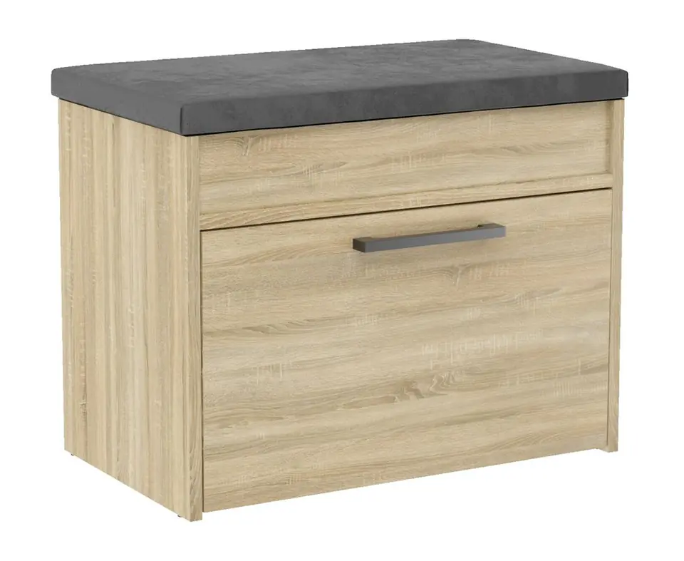 Komfortowa szafka na obuwie z tapicerowanym siedziskiem oraz schowkiem na gadżety. Szafka posiada uchylne drzwi za którymi znajduje się półka.