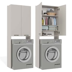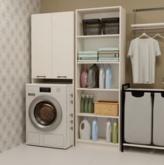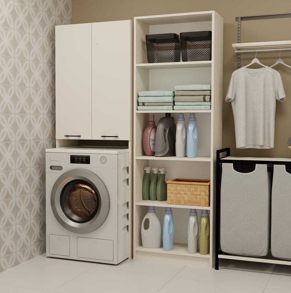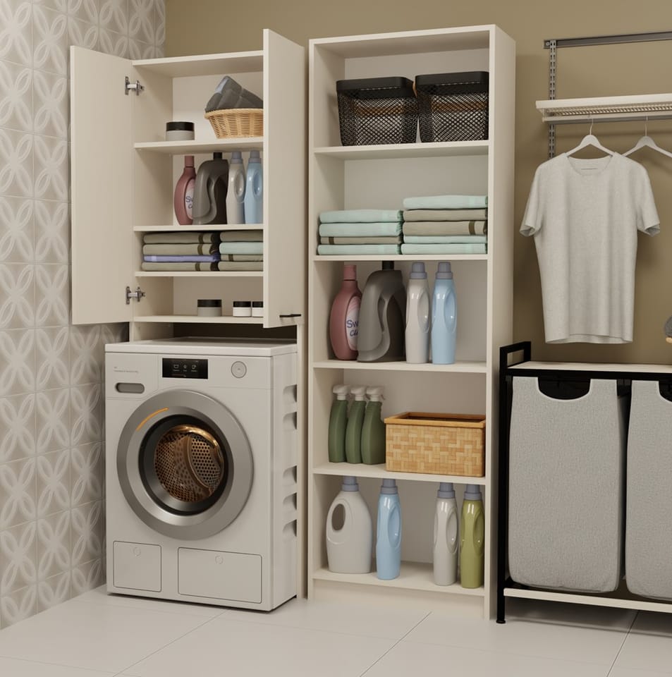 - 4 pojemne półki schowane za drzwiami – idealne na ręczniki, detergenty i akcesoria.