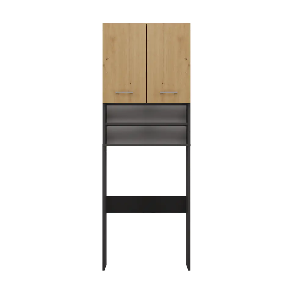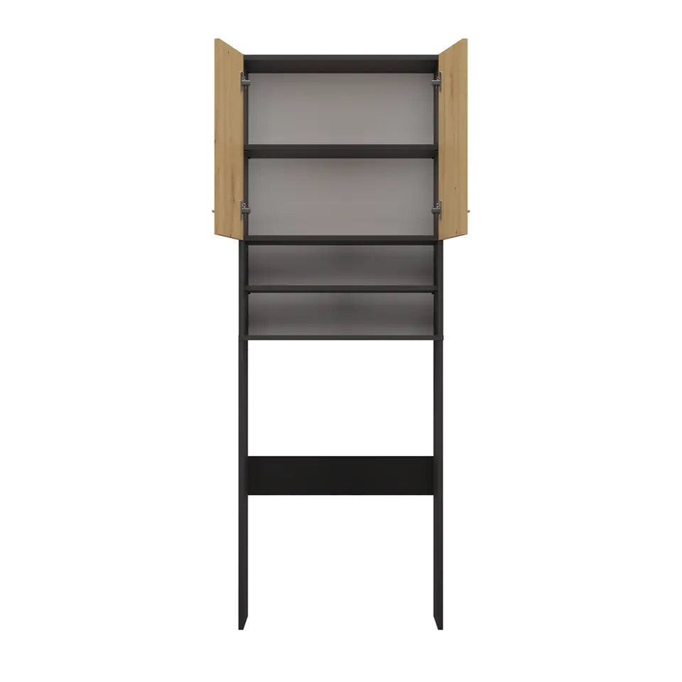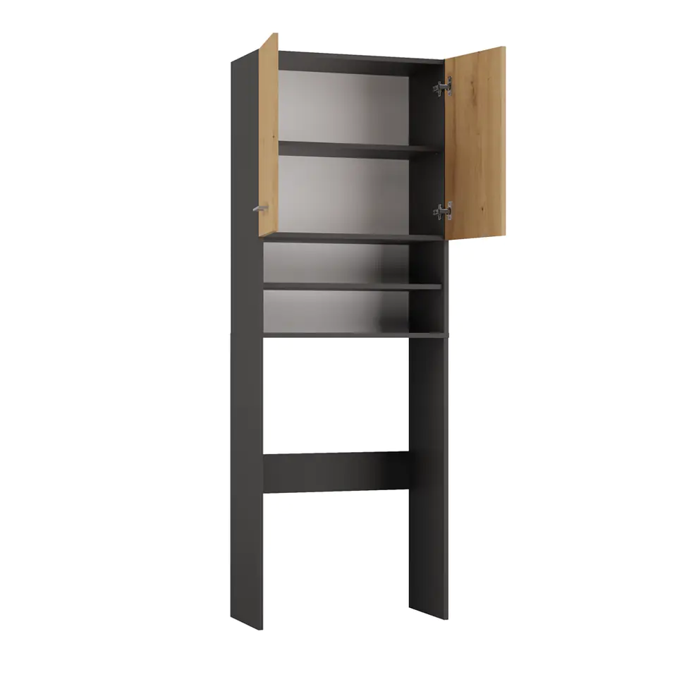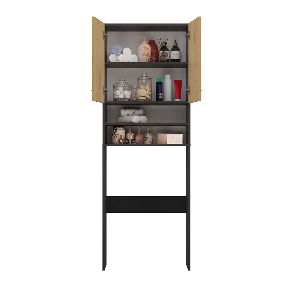 Szafka posiada 2 półki schowane za drzwiczkami oraz 2 półki odsłonięte.