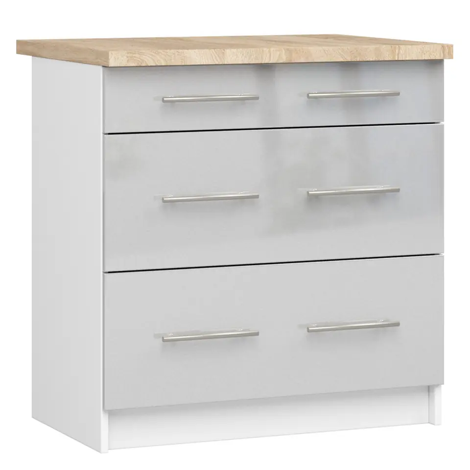 Szafka kuchenna S 80cm 3S to propozycja pochodząca z kolekcji Oliwia. Dzięki niej będzie możliwe stworzenie pięknej, funkcjonalnej kuchni. Meble w połysku nie od dziś cieszą się ogromną popularnością. Nic dziwnego - pięknie prezentują się w każdym pomieszczeniu, są łatwe w czyszczeniu i praktyczne. Biała szafka z frontami w betonie składająca się z trzech szuflad na pewno bardzo dobrze sprawdzi się w każdej kuchni, zapewniając dużo miejsca na przechowywanie najpotrzebniejszych rzeczy - sztućców, naczyń, a także środków czystości i artykułów spożywczych. Mebel wykazuje dużą odporność na ścieranie, jest wytrzymały i przyjemny dla oka. Propozycja dostępna jest w naszym sklepie internetowym w świetnej cenie, a do szafki można dopasować inne elementy nowoczesnej kolekcji Oliwia, które pozwolą stworzyć pasującą do siebie całość.