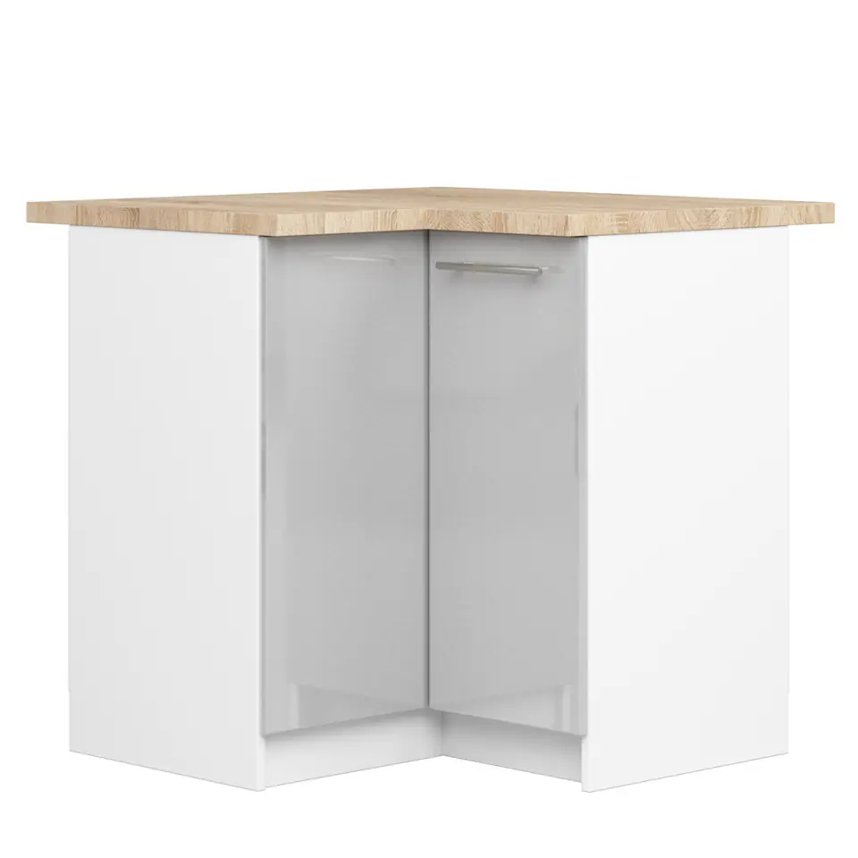 Kuchnia to pomieszczenie będące sercem każdego domu. To właśnie tutaj domownicy codziennie przygotowują liczne posiłki, oddając się rozmowom oraz spędzając razem czas. Nic więc dziwnego, że każdy chce swoją kuchnię urządzić w sposób zarówno funkcjonalny, jak i przyjemny dla oka. Meble pochodzące z kolekcji Oliwia z pewnością w tym pomogą. Prezentujemy jeden z elementów pochodzących właśnie z tego zestawu modułowego - szafkę narożną S90/90N zaprojektowaną w modnym kolorze białym z frontami metalik połysk, z którym doskonale kontrastują czarne, matowe uchwyty, tworząc niepowtarzalną całość. Elegancki mebel umożliwia otworzenie drzwiczek na prawą oraz lewą stronę, dzięki czemu możliwe jest uzyskanie swobodnego dostępu do dużej przestrzeni, w której można umieścić wiele artykułów niezbędnych w każdej kuchni, środków czystości czy produktów spożywczych.