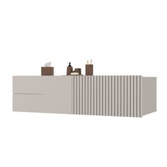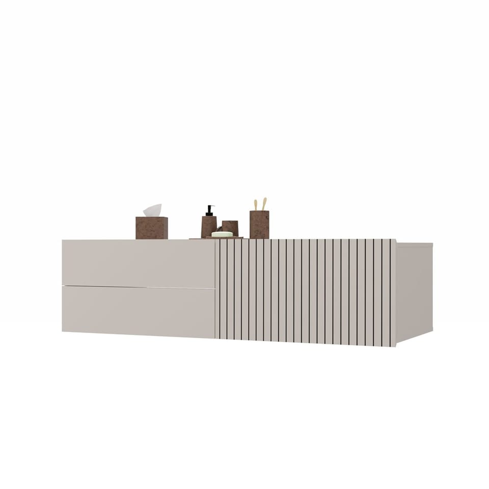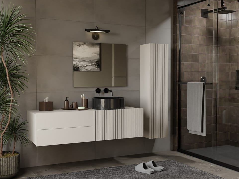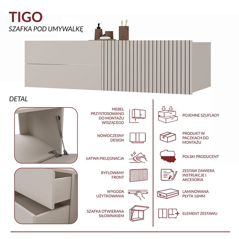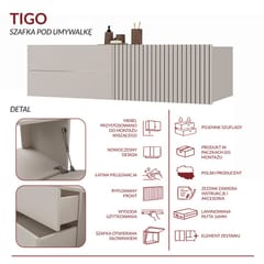 TIGO 1D2S to elegancka i funkcjonalna szafka łazienkowa, która zachwyca nowoczesnym designem i perfekcyjnym wykonaniem. Charakterystyczny front z pionowym frezowaniem (imitacja lameli) w ciepłym wybarwieniu Kaszmir nadaje meblowi stylowego i naturalnego charakteru.