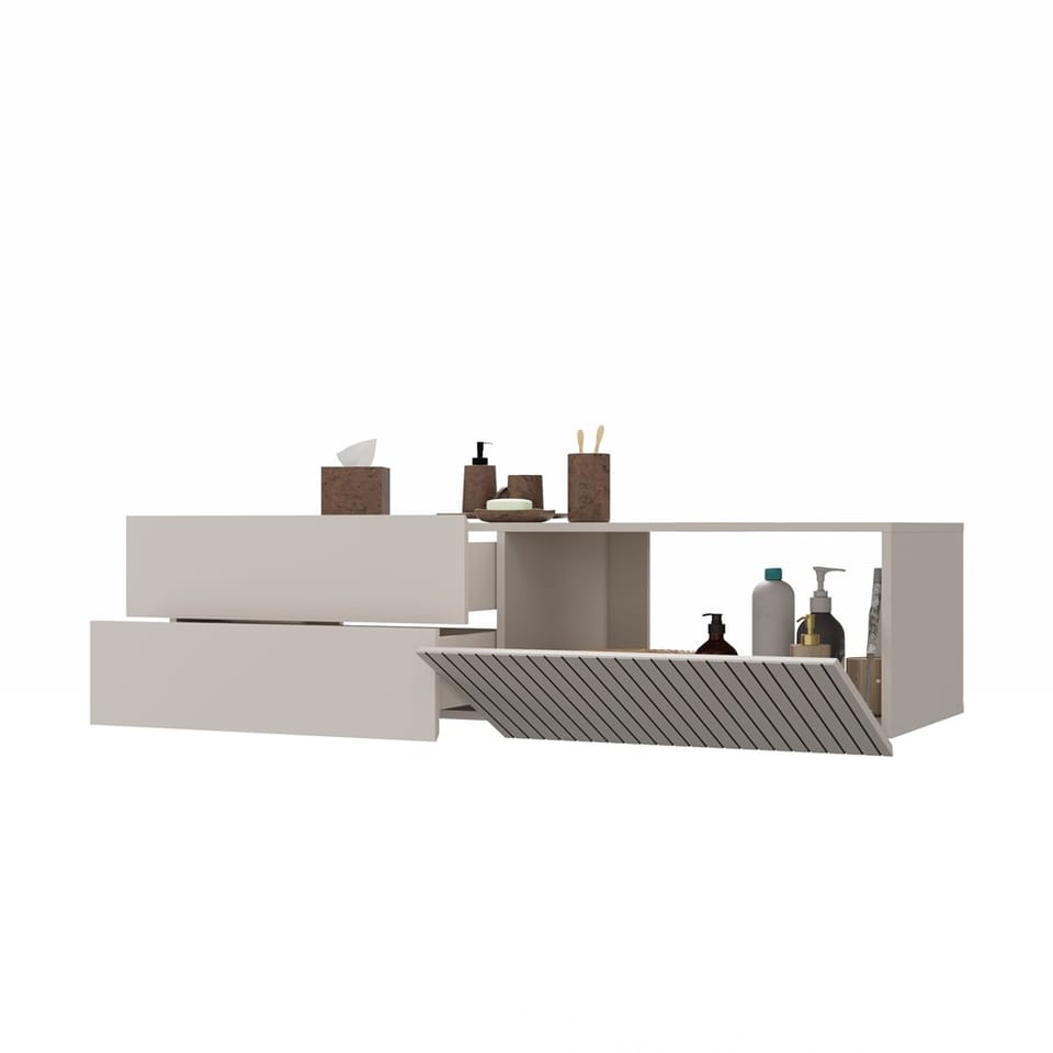 Szafka przeznaczona jest do montażu pod umywalkę nablatową – otwarta przestrzeń na syfon oraz przemyślany układ schowków i szuflad czynią ją niezwykle praktycznym rozwiązaniem.