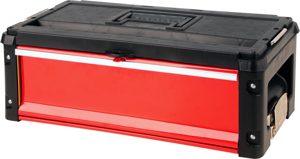 Skrzynka modułowa z 1 szufladą. Posiada 1 szufladą metalową o nośności 10 kg i wymiarach 390x215x130 mm. Szuflada zamontowana jest na prowadnicach metalowych z łożyskami kuleczkowymi. Moduł posiada płaski blat, który może służyć jako blat roboczy. Ponadto posiada rowek bardzo przydatny podczas wiercenia lub wkręcania wkrętów.