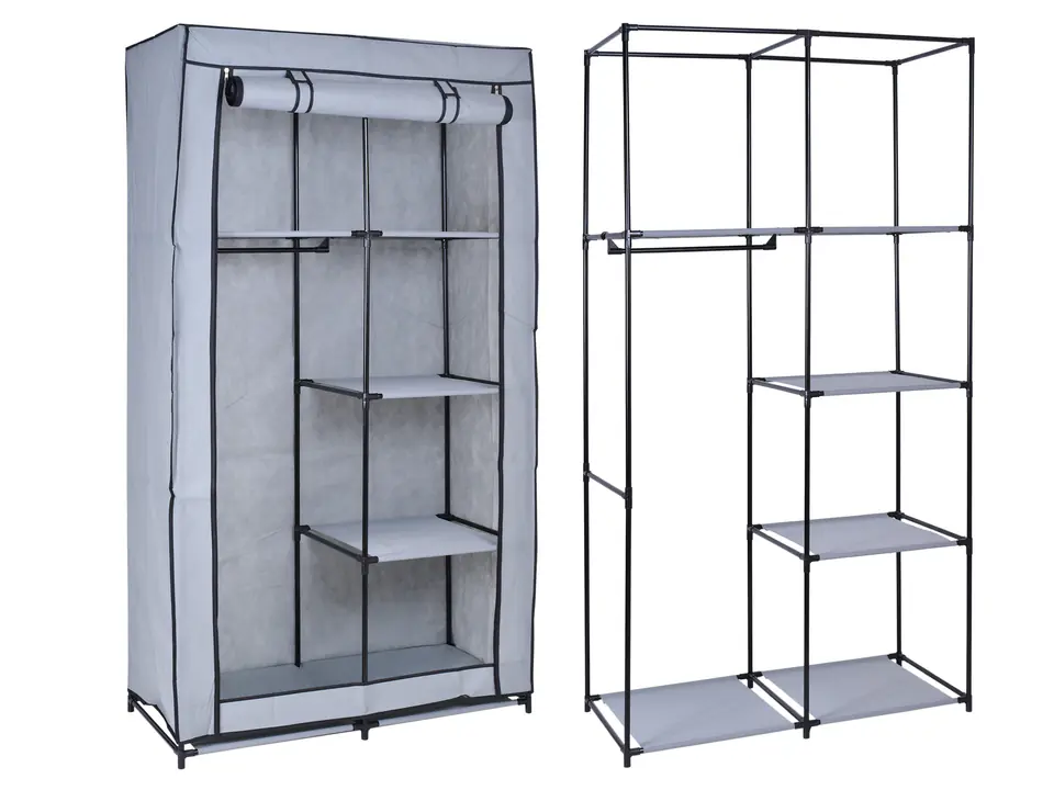 Szafka tekstylna MIRA - szaraModel: MIRA | Kolor: szary Lekkie szafy tekstylne to proste i ekonomiczne rozwiązanie problemu przechowywania odzieży. Szafy mają metalowy stelaż z łącznikami z tworzywa sztucznego, są proste i szybkie w montażu oraz dostępne w wielu modnych kolorach i wzorach. Materiałowa garderoba sprawdzi się też u osób często zmieniających miejsce zamieszkania - składa się ją w kilka minut. Cechy produktuŁatwy w montażuLekka i stabilna konstrukcjaMetalowy stelażEstetyczne wykonanieNowoczesnośćZamykana na zamek błyskawicznyDrążek na wieszaki Wymiary produktuWysokość: 170 cmGłębokość: 45 cmSzerokość: 90 cm Informacje dodatkowePrzedstawione kolory należy traktować poglądowo - mogą odbiegać od rzeczywistych ze względu na różne ustawienia monitorów oraz proces obróbki zdjęć. Rzeczywiste wymiary mogą się różnić od podanych wyżej. Tolerancja błędów może wynosić +/- 5%. Marka:GockowiakKod produktu:311738MGKolor:szaryWysokość: 170 cmSzerokość:90 cmMateriał:tekstylnyMateriał stelaża:metalPrzeznaczenie:pokój | sypialnia | salon | biuroDo samodzielnego montażu:tak