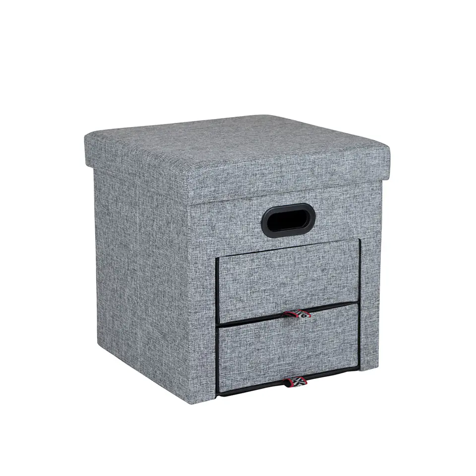 Praktyczna pufa w kształcie sześcianu wykonana z poliestru Oxford o lnianym wyglądzie w kolorze szarym.