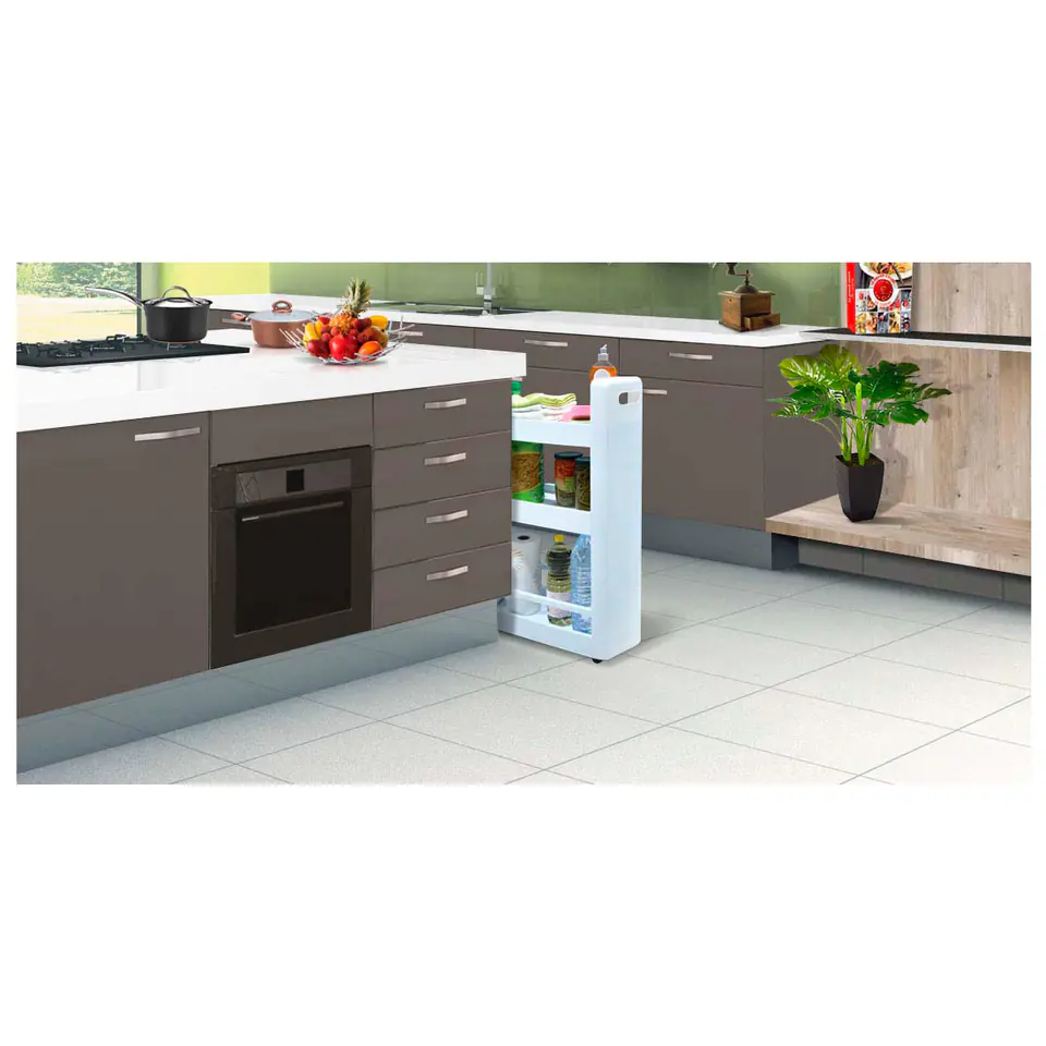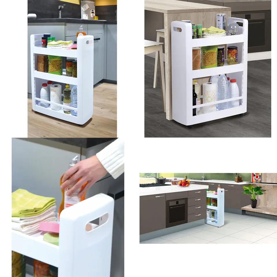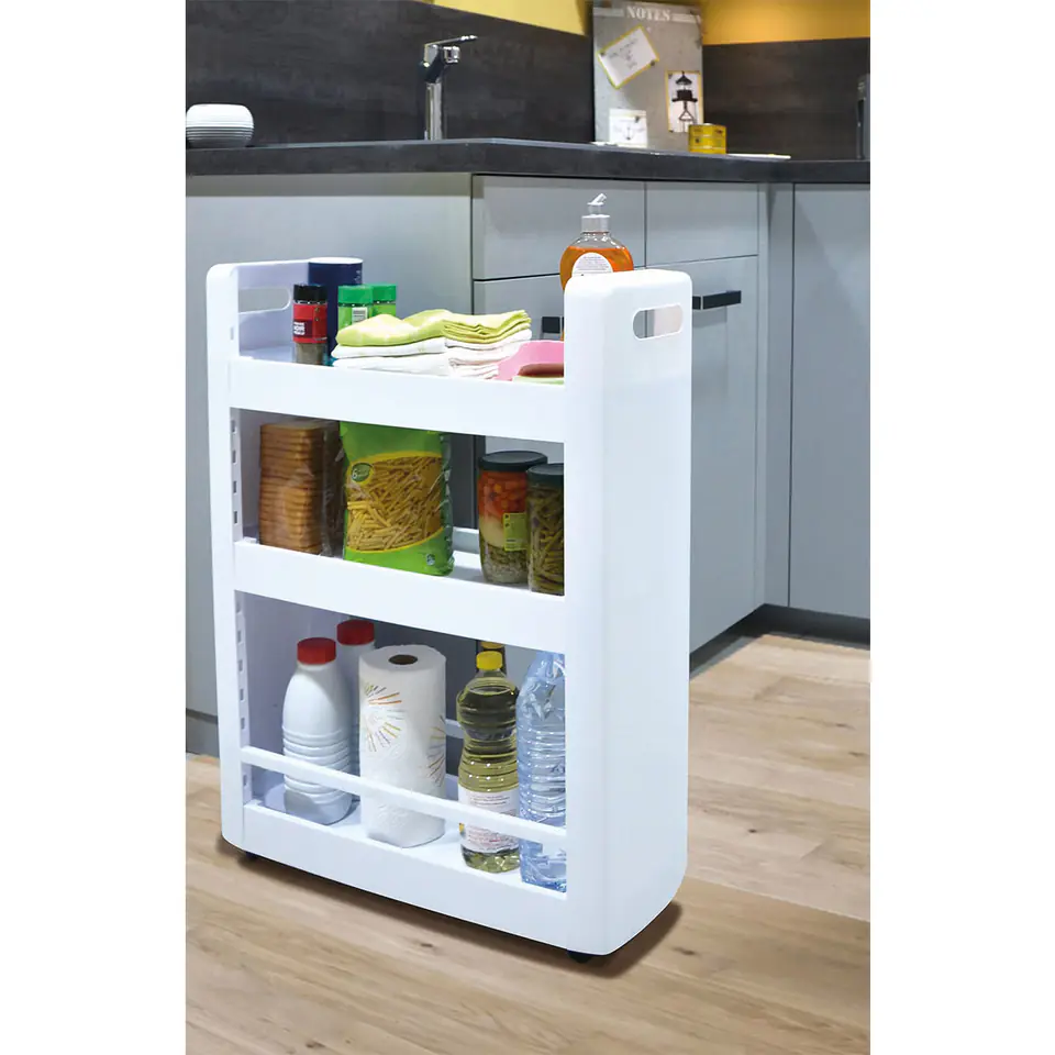 Ułatwia zagospodarowanie niewykorzystanej lub nieustawnej przestrzeni w kuchni, można wstawić ją między szafki lub schować pod stołem, wówczas na półkach bez problemu zmieszczą się puszki, butelki, przybory do gotowania lub książki kucharskie.