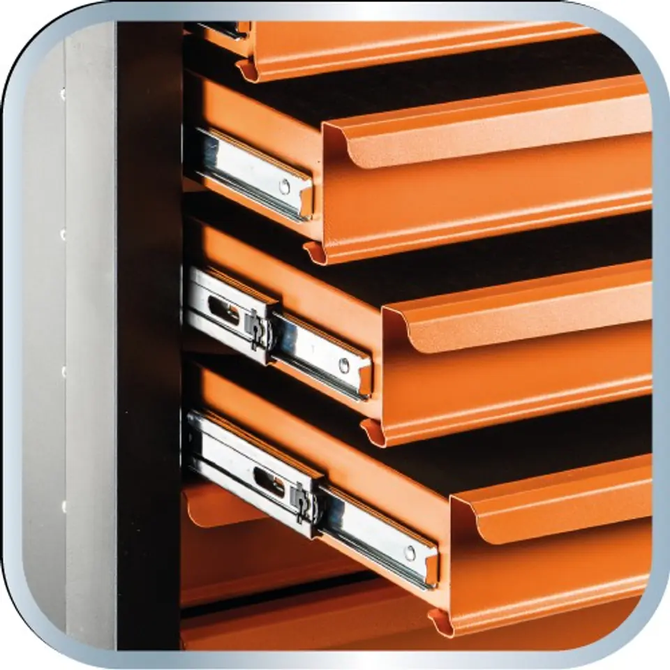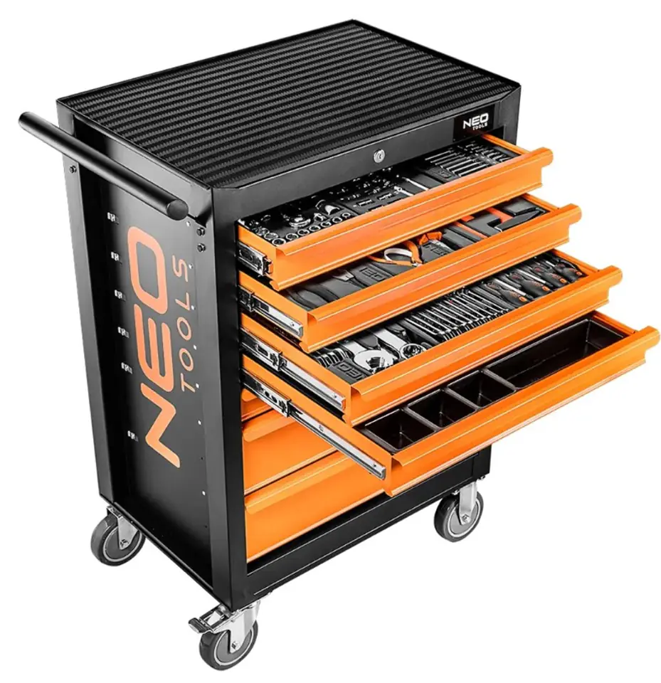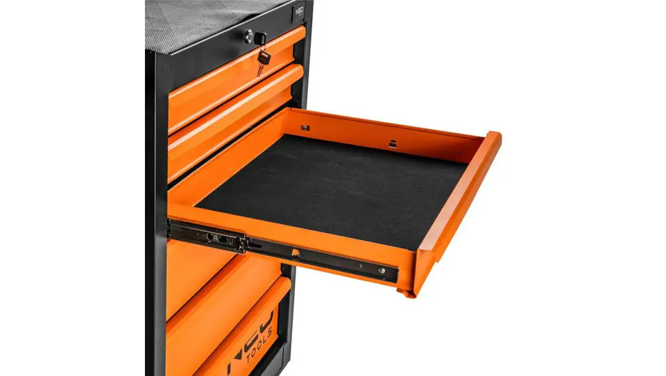 Szafka narzędziowa, 7 szuflad, (LxWxH) 680 x 460 x 1030 mm, nośność 280 kg, stalowy korpus, centralny zamek, gumowa wykładzina na blacie, prowadnice kulkowe, blokada kół, koła 5" z PVC, boczny uchwyt, dwa klucze, dodatkowe wyposażenie w produktu o nr ref. : 84-237, 84-238, 84-236, 84-240, 84-230, 84-242, 84-235, 84-234, 84-232, 84-249