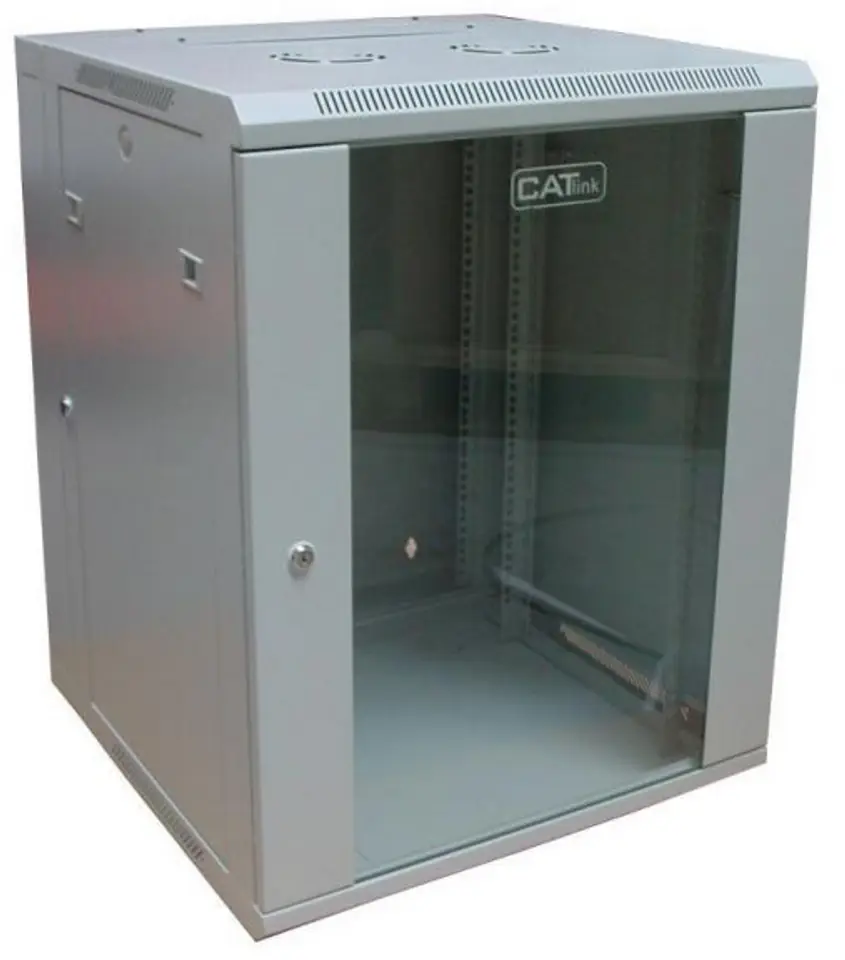 Krosowa szafa wisząca dwusekcyjna marki Katlink, koloru szarego. Przeznaczona dla urządzeń 19 calowych. Głębokość szafy to 600 mm, a wysokość montażowa to 15U. Drzwi przednie są szklane i zamykane na zamek, a osłony boczne są stalowe i demontowane.