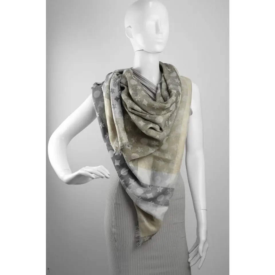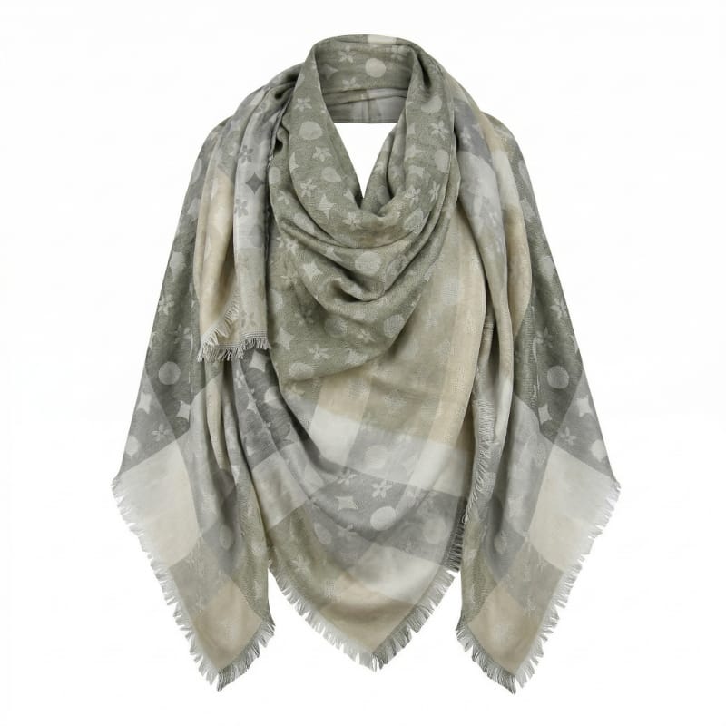 Elegancki szal / chusta w odcieniach koloru szarego i beżowegoWymiary :140 cm x 140 cmMateriał :100 % PoliesterIdealny do jesiennych kurtek oraz zimowych płaszczy.