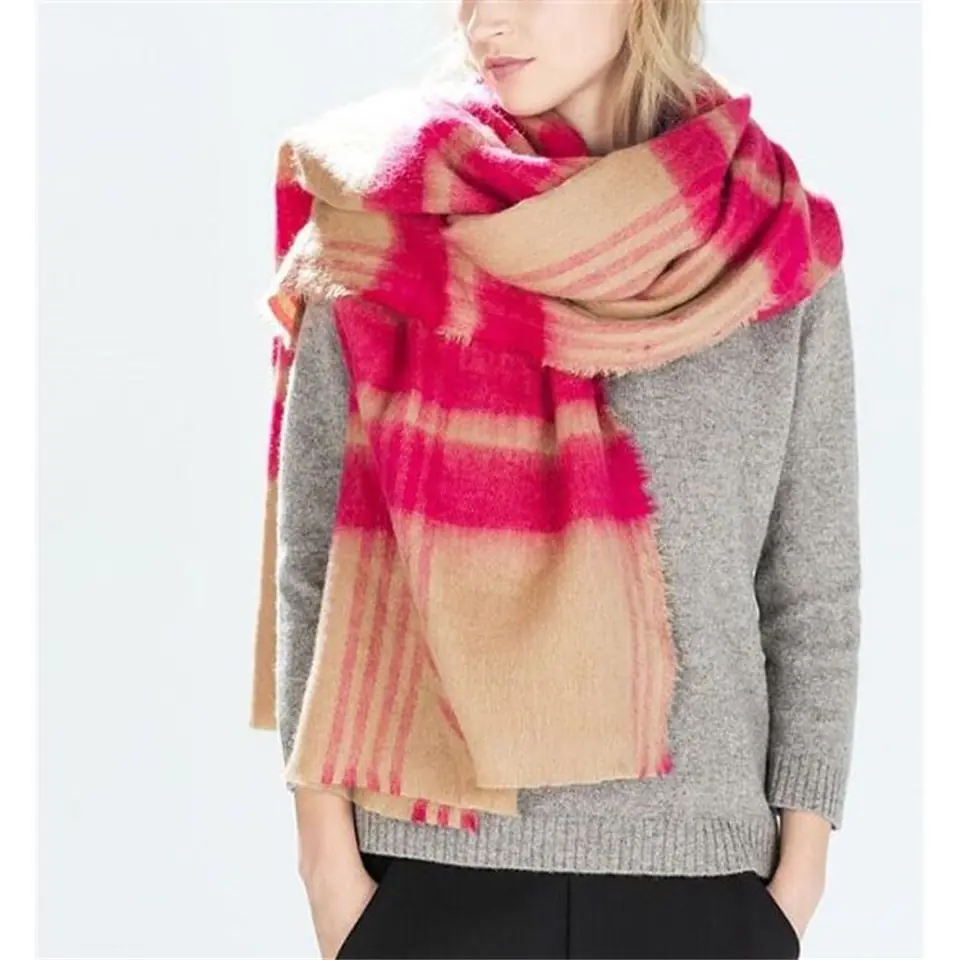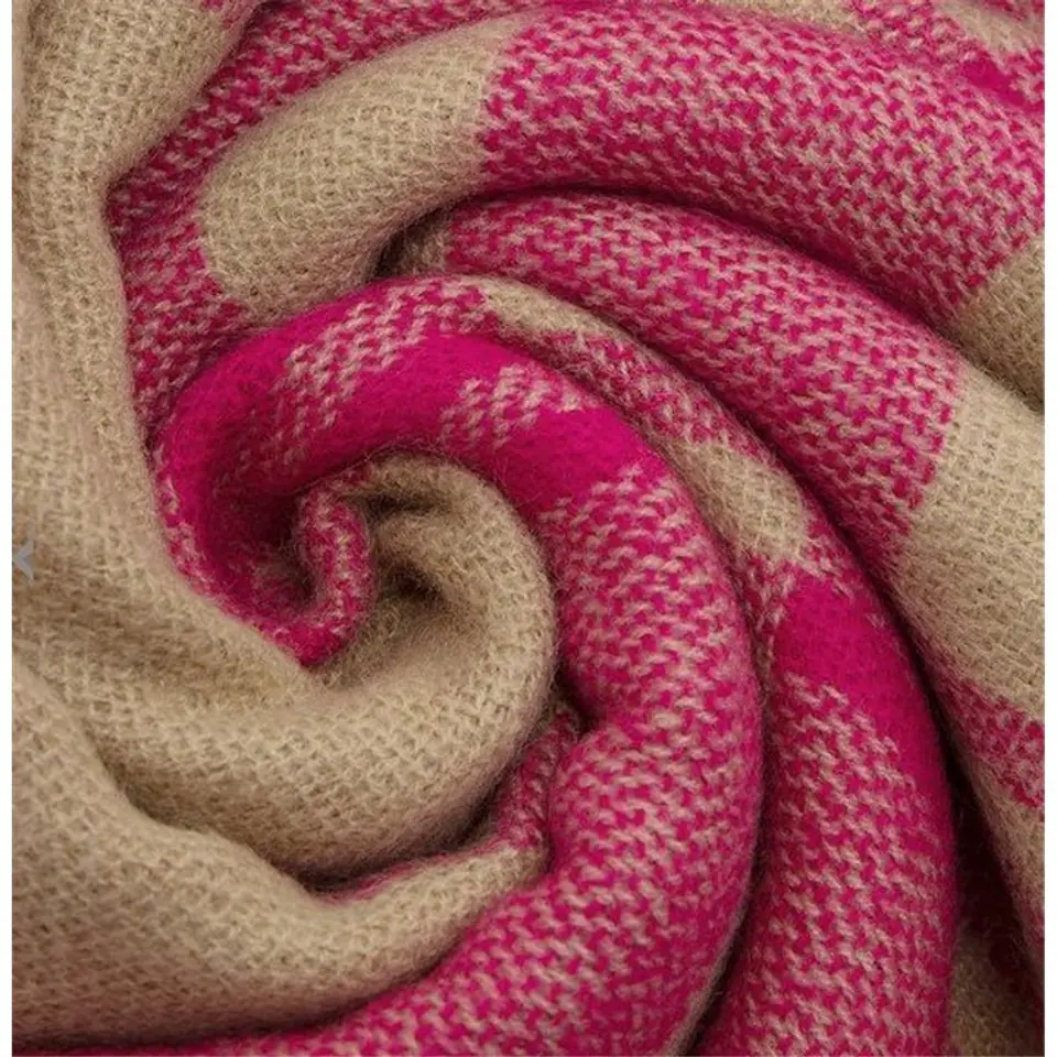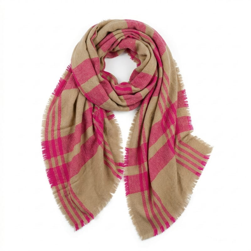 Elegancki szal / chusta w kolorach beżu i różuWymiary :190 cm x 85 cmMateriał :80 % wiskoza20 % bawełna Idealny do jesiennych kurtek oraz zimowych płaszczy.