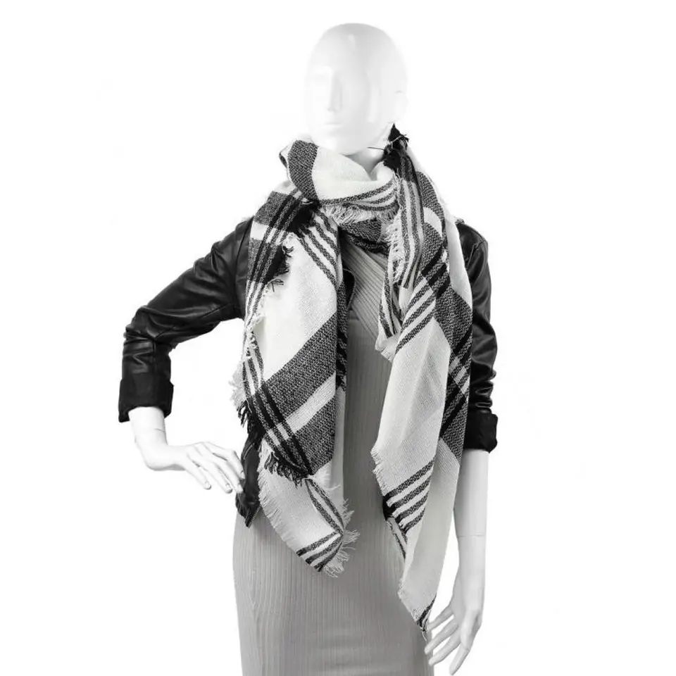 Elegancki szal / chusta w kolorach bieli i czerniWymiary :190 cm x 85 cmMateriał :80 % wiskoza20 % bawełna Idealny do jesiennych kurtek oraz zimowych płaszczy.