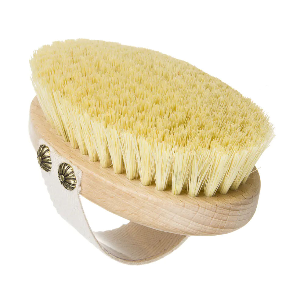 W 100% naturalna szczotka do masażu ciała na sucho.Szczotka wykonana jest bardzo precyzyjnie i solidnie, każdy detal jest dopieszczony począwszy od jakości drewna bukowego, specjalnie dobranym włóknem naturalnym z agawy (tampico) a skończywszy na detalach takich jak pas i ozdobne gwoździe.Należy pamiętać, iż używając drewnianej szczotki na mokro, mogą się zdarzyć pęknięcia drewna.