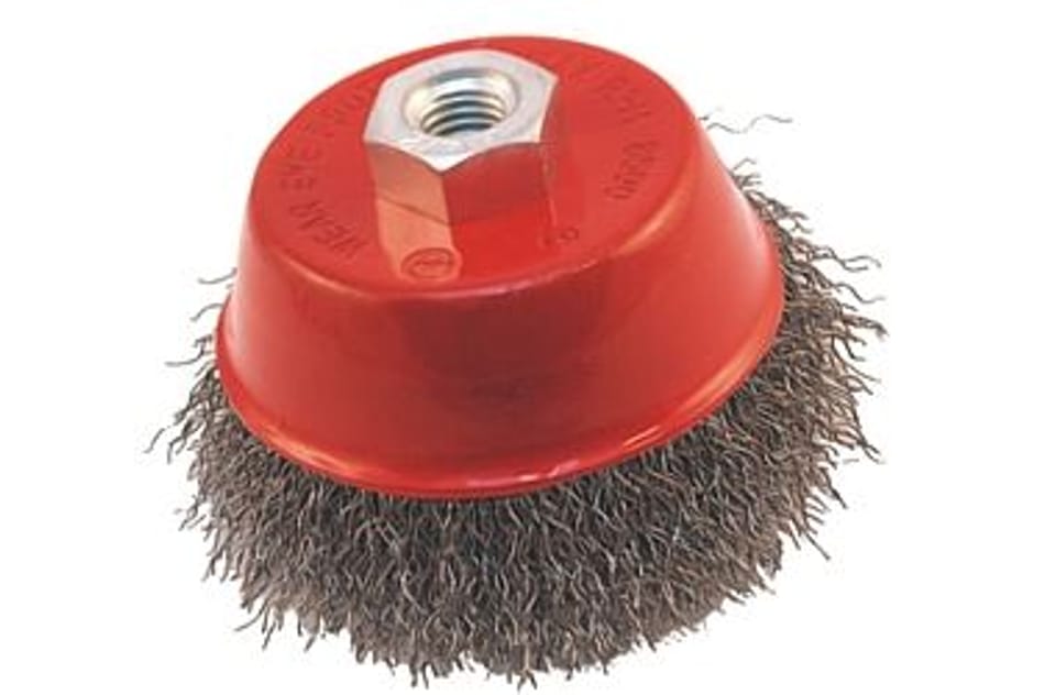 Szczotka druciana obrotowa, doczołowa. Średnica szczotki: 80 mm.