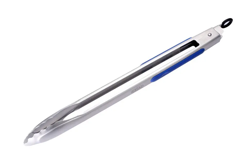 Solidne stalowe szczypce z silikonowymi, niebieskimi nakładkami na rączce. Doskonały kompan do grillowania na kempingu. Pozwala na wygodne podawanie potraw z grilla. Blokada w rączce ułatwia przechowywanie. Nadaje się do zmywarki.