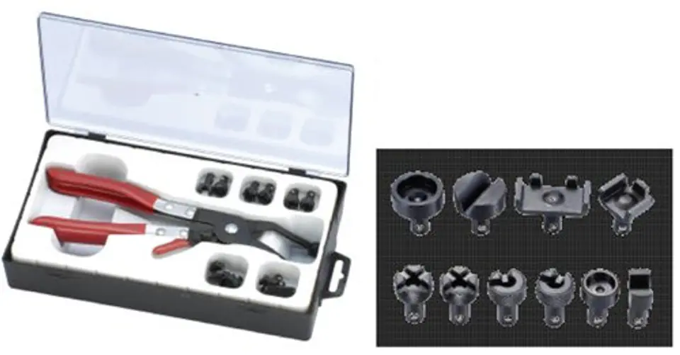 Szczypce przeznaczone do opasek samozaciskowych o płaskim przekroju. Posiadają końcówki z jednej strony okrągłą, ponacinaną, obrotową, z drugiej strony z głębokim wcięciem co umożliwia lepsze uchwycenie i ściśnięcie opaski, drugie nacięcia krzyżakowe." szczypce do opasek zaciskowych na przewodach gumowych (układ chłodzenia, paliwowy, olejowy itp) " długość szczypiec: 210 mm " blokada zapadkowa - uniemożliwia poluzowanie się opaski"