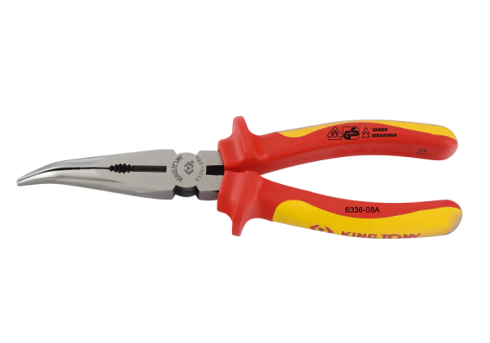 Izolowane szczypce wąskie wygięte firmy King Tony. Długość szczypiec 200 mm, maksymalna średnica przecinanego drutu to 4 mm (dla miękkich materiałów) . Izolacja do 1000V. Karta produktu - 6336-08A