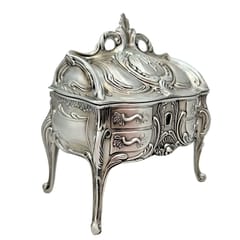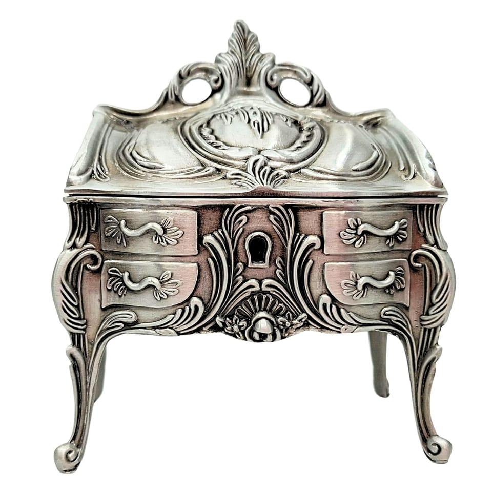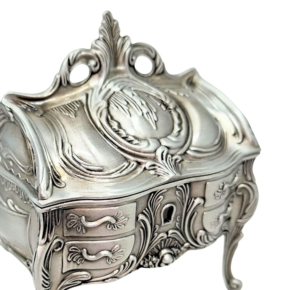 Szkatułka na Biżuterię Metalowa Srebrna Retro - 2056M Elegancka szkatułka na biżuterię wykonana z metalu to dodatek, który łączy funkcjonalność z wyjątkową estetyką minionych epok. Jej design nawiązuje do stylu rococo, wyróżniając się bogatymi, florystycznymi ornamentami oraz formą osadzoną na smukłych, profilowanych nóżkach. INFORMACJE O PRODUKCIE: • Materiał: metal • Wymiary: 9,7 x 10 x 6,7 cm DLACZEGO WARTO: • Ponadczasowy Design: Szkatułka osadzona na smukłych, giętych nóżkach, zdobiona motywami florystycznymi i ornamentami w stylu rococo. • Solidność Metalu: Wykonana z trwałego metalu, co gwarantuje jej długowieczność • Efektowna Dekoracja: Idealnie prezentuje się na toaletce, komodzie czy stoliku nocnym, nadając sypialni lub salonowi luksusowy charakter. • Praktyczne Przechowywanie: Kompaktowe wymiary sprawiają, że jest to bezpieczny „skarbiec” na Twoje ulubione pierścionki, kolczyki czy pamiątkowe drobiazgi. IDEALNY POMYSŁ NA PREZENT Szukasz upominku, który wywoła uśmiech i zostanie zapamiętany na lata? Szkatułka Retro to gotowe rozwiązanie na: • Dzień Matki lub Dzień Babci – jako wyraz wdzięczności i elegancji. • Urodziny lub Imieniny – dla kobiety ceniącej styl vintage. • Podziękowanie – jako stylowy gest dla bliskiej osoby.