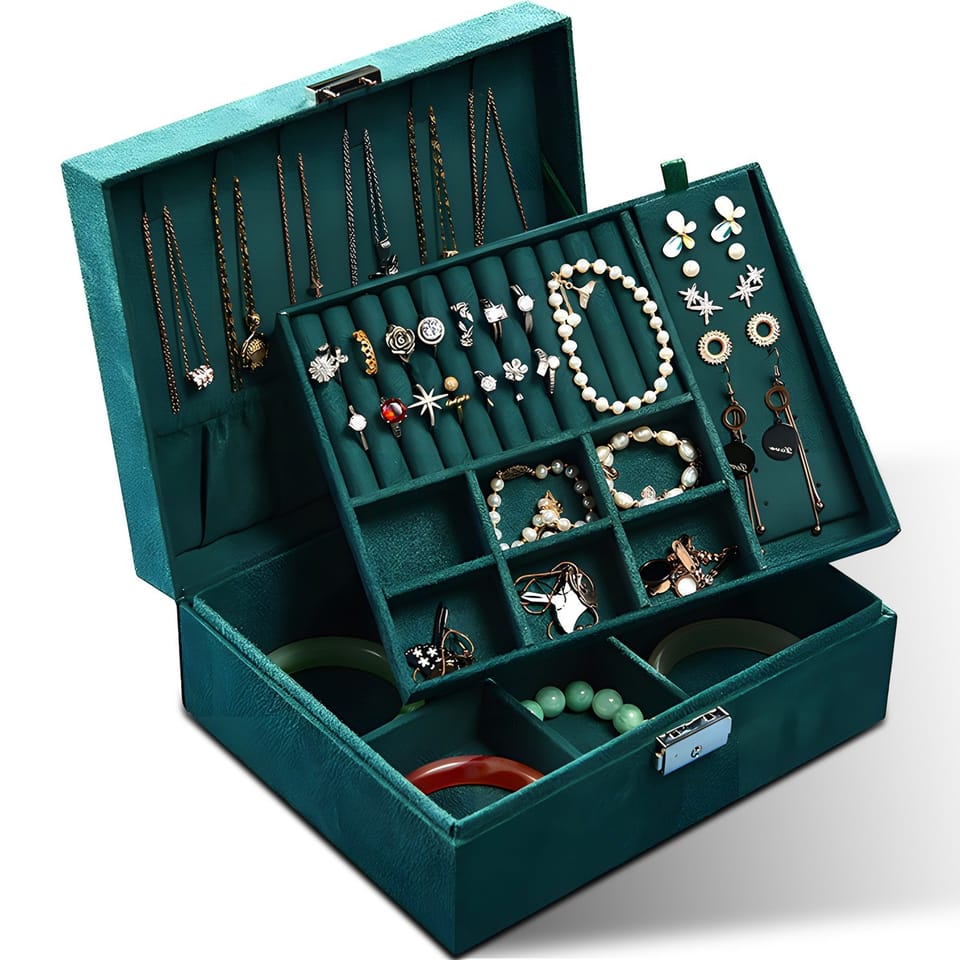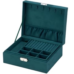 Kod produktu: 1029543Elegancka szkatułka na biżuterię wykonana z ciemnozielonego zamszu to doskonałe rozwiązanie do przechowywania i organizacji biżuterii. Klasyczna, minimalistyczna forma doskonale komponuje się zarówno z nowoczesnymi, jak i stylizowanymi na retro wnętrzami. Zamykana na kluczyk, chroni kosztowności przed dostępem osób niepowołanych, kurzem i uszkodzeniem. Posiada wiele przegródek i funkcjonalnych rozwiązań, dzięki którym idealnie sprawdzi się zarówno u amatorów, jak i kolekcjonerek biżuterii.Cechy produktu: