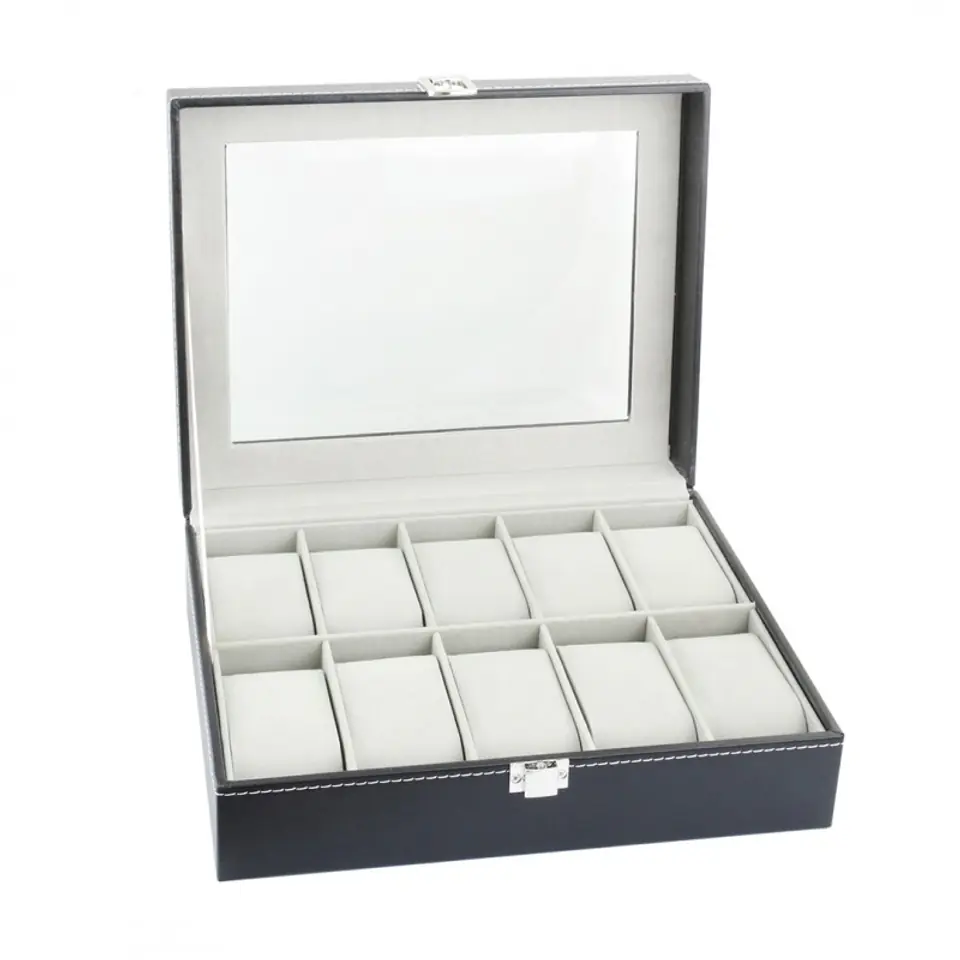 Przepiękna i niezwykle funkcjonalna szkatułka.Szkatułka idealnie nadaje się na prezent. Jest niezwykle praktyczna i doskonale chroni zegarki, biżuterię bądź bransoletki przed kurzem i zarysowaniami.Najważniejsze informacje:- wysokiej jakości wykonanie;- niewielkie rozmiary, ale bardzo funkcjonalny - pozwala wygodnie przechować 10 zegarków;- posiada solidny metalowy zamek;- zapewni najwyższą ochronę dla Twoich zegarków;- wykonana z eleganckiego materiału;- środek wypełniony miękkim pluszowym materiałem:- przezroczyste okienko, pozwalające przeglądać zawartość szkatułki.Wymiary:- 25,5 x 20,4 x 8 cm - szerokość pojedynczej przegrody: 4,5 cm- długość pojedynczej przegrody: 9,2 cm- wysokość pojedynczej przegrody: 3,8 cm- poduszeczka: 4,5 x 7,5 x 3,2 cm