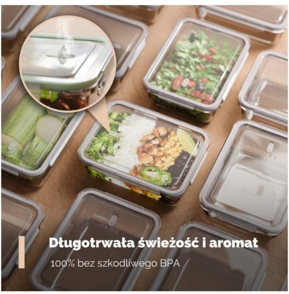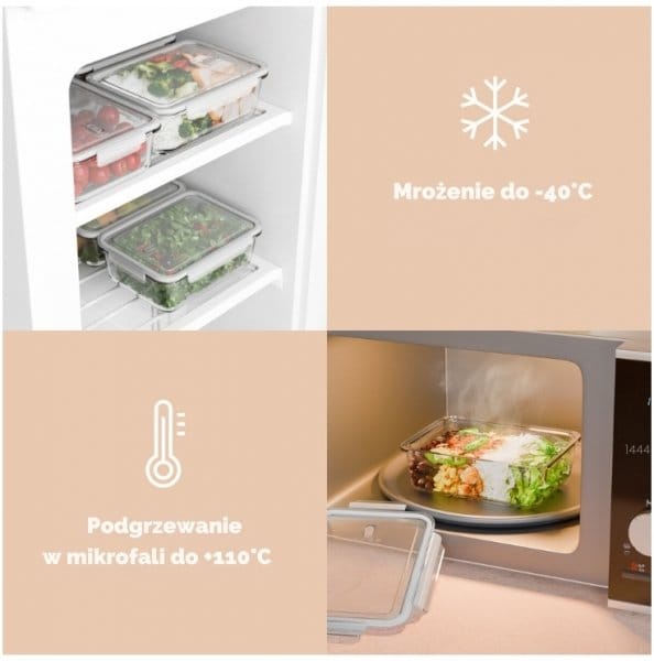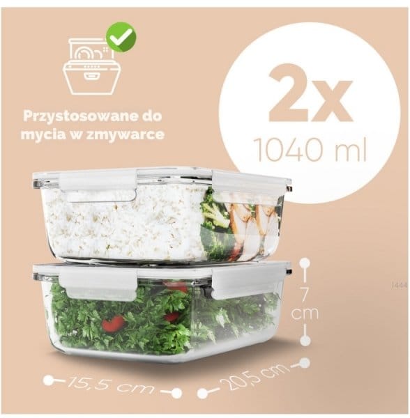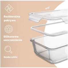Szklane pojemniki do przechowywania żywności 2x Classbach C-FHD 4024 GClassbach C-FHD 4024 G to zestaw składający się z 2 transparentnych, szklanych pojemników z hermetycznym zamknięciem o pojemności 1040 ml. Są stworzone do przechowywania żywności, zarówno składników jak i całych dań. Pojemniki są również świetnym rozwiązaniem jeśli chcemy zabrać ze sobą ulubioną potrawę do pracy. Posiadają one hermetyczne zamknięcia Click & Safe, dzięki którym żywność nie będzie się wylewać ani wysypywać, co mogło by wpłynąć negatywnie na bezpośrednie otoczenie pojemnika czy świeżość przechowywanych potraw. Pokrywy pojemników posiadają zaworki, które pozwalają na regulację dostępu powietrza do przechowywanej żywności. Jest to niezwykle ważne w przypadku świeżych warzyw czy owoców – kontrolowany dostęp tlenu z zewnątrz pozwala na wydłużone zachowanie świeżości. Otwarty zaworek pozwala również na wydostanie się nadmiaru pary z gorących potraw umieszczonych i zamkniętych w pojemniku.Zestaw C-FHD 4024 G został wykonany ze szkła oraz z wysokiej jakości tworzywa sztucznego. Pokrywy są odporne na temperaturę w zakresie -40 do +110°C, natomiast elementy ze szkła -40 do +400°C. Możemy więc przechowywać je w zamrażarce, podgrzewać w nich potrawy przy użyciu kuchenki mikrofalowej a po zdjęciu pokrywy nawet piekarnika! Materiały z który wykonano pojemniki są bezpieczne dla zdrowia i pozbawione szkodliwych substancji (BPA FREE)Pojemniki są niezwykle łatwe w utrzymaniu czystości - uszczelka jest demontowalna a całość możemy umyć przy pomocy zmywarki do naczyń.Najważniejsze cechy zestawu Classbach C-FHD 4024 G:Zestaw 2 szklanych pojemników na żywność do wszechstronnego zastosowaniaIdealne do zamrażania, podgrzewania, przechowywania oraz transportuPrzechowywanie żywności takiej jak przykładowo posiłki, sosy, warzywa, owoce, gofry czy jedzenie dla dzieciPozbawione szkodliwego BPAPojemność: 1040 mlUtrzymują 100% szczelność dzięki praktycznemu zamknięciu Click & Safe oraz sylikonowej uszczelce w pokrywieŁatwa obsługaDługotrwała świeżośćDługotrwały aromatOdporność na temperaturę w zakresie –40 do +400°CZamrażarka do –40 °CKuchenka mikrofalowa do +110°CPiekarnik do +400°C (bez pokrywy)Łatwa obsługa i czyszczenie dzięki demontowalnej pokrywie i uszczelceOznaczenia CE - spełnia wszystkie restrykcyjne normy UEPrzystosowane do mycia w zmywarceDlaczego warto kupić zestaw pojemników Classbach C-FHD ?WielofunkcyjneDwa pojemniki o pojemności 1040 ml każdy, przeznaczone do przechowywania żywności z hermetycznym zamknięciem - idealne do przechowywania żywności, zarówno składników jak i całych dańBezpieczne Hermetyczne zamknięcia Click & Safe, dzięki którym żywność nie będzie się wylewać ani wysypywać. Tworzywo jest bezpieczne dla zdrowia i pozbawione szkodliwych substancjiOdporne na temperaturęPokrywy są odporne na temperaturę w zakresie -40 do +110°C, natomiast elementy ze szkła -40 do +400°C. Możemy więc przechowywać je w zamrażarce, podgrzewać w nich potrawy przy użyciu kuchenki mikrofalowej a po zdjęciu pokrywy nawet piekarnika!Łatwe w czyszczeniuPojemniki są niezwykle łatwe w utrzymaniu czystości - uszczelka jest demontowalna a całość możemy umyć przy pomocy zmywarki do naczyńIdealne na prezentPojemniki posiadają eleganckie opakowanie, dzięki czemu idealnie sprawdzi się, jako prezent!Wymiary:Wymiary (ok. szer. x wys. x gł.) pojemnik + pokrywa:(1040 ml) 205 x 70 x 155 mmPojemniki wolne od BPACertyfikat BPA Free daje świadectwo, iż produkty są tworzone w trosce o Twoje zdrowie i bezpieczeństwo.Pojemniki zostały wykonane z tworzyw wolnych od BPA, dzięki temu masz pewność, że produkty w nich przechowywane będą wolne od szkodliwych dla organizmu, toksycznych cząstek Bisfenolu A...