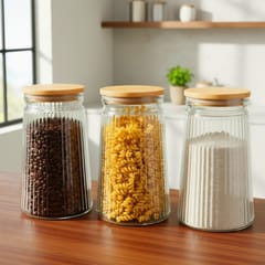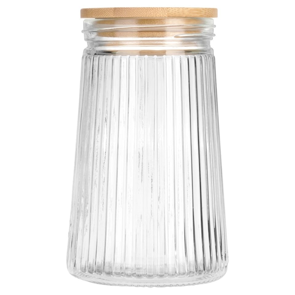 - Odporne szkło i drewniana pokrywka - Pojemnik wykonany ze szkła borokrzemowego, które cechuje się dużą odpornością na zmianę temperatur. Szkło ma eleganckie zdobienia w postaci ryflowanej powierzchni, co nadaje mu efektowny wygląd. Pokrywka wykonana z drewna bambusowego.