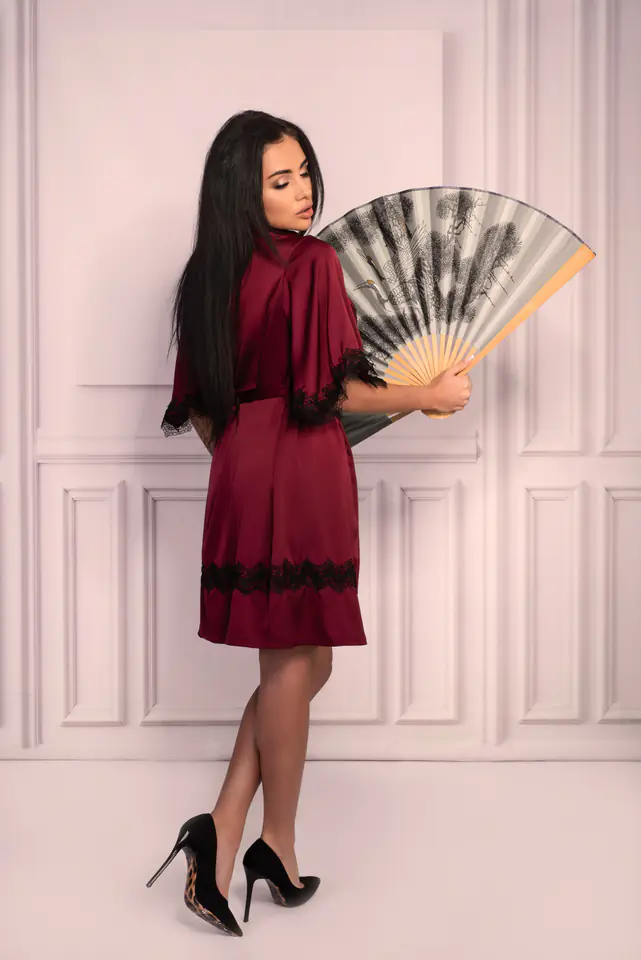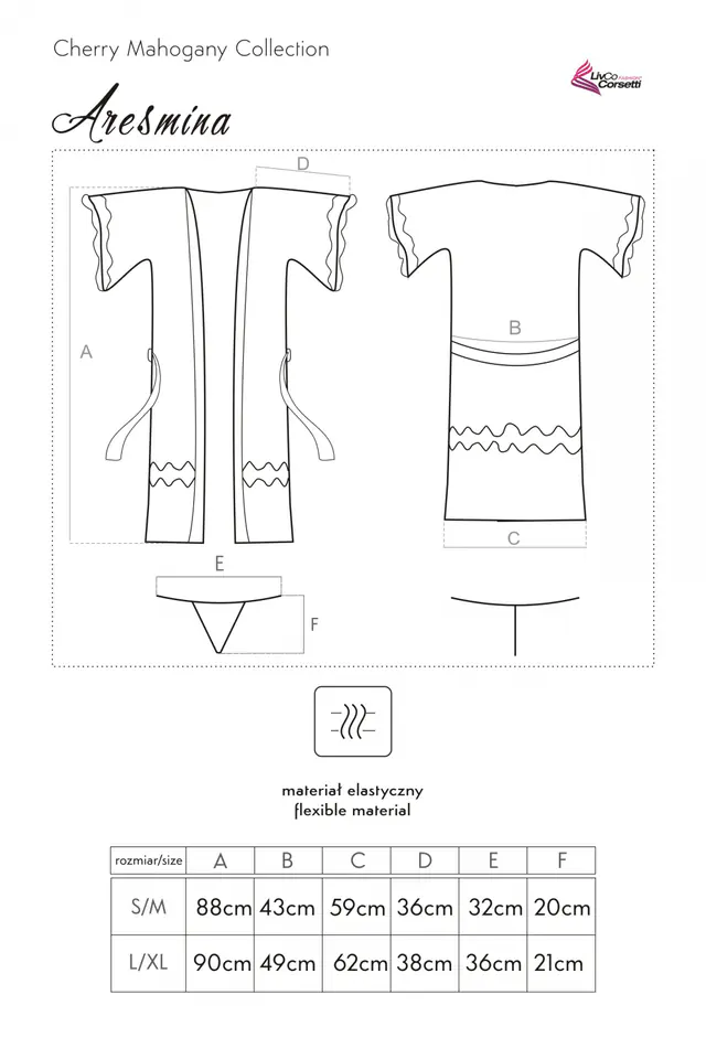 Aresmina LC 90564 to wyjątkowy szlafrok z kolekcji Cherry Mahogany, który z pewnością przyciągnie uwagę każdej miłośniczki luksusowych i eleganckich dodatków. Wykonany jest z miękkiej, ale zarazem wytrzymałej mieszanki poliestru i elastanu, dzięki czemu zapewnia on nie tylko wygodę, ale jest także bardzo trwały. Szlafrok posiada szerokie i krótkie rękawy oraz pasek na wysokości talii, który pozwala na jego zwężanie - jego zmysłowy, a jednocześnie elegancki krój idealnie podkreśla piękno ciała, niezależnie od jego kształtu. Całość została wykonana w pięknej satynowej, bordowej kolorystyce, która podkreślona została subtelną czarną koronką. Aresmina LC 90564 jest idealnym wyborem dla kobiet ceniących sobie funkcjonalność z jednej strony oraz zarazem stylowy, jak i wytrzymały design z drugiej; cenią luksus i piękno, lecz nie chcą rezygnować z sypialnianej wygody. Szlafrok można wykorzystać jako przytulny element garderoby do spania lub relaksu w domu, jednocześnie będąc pewną swojego dobrego wyglądu w każdej chwili