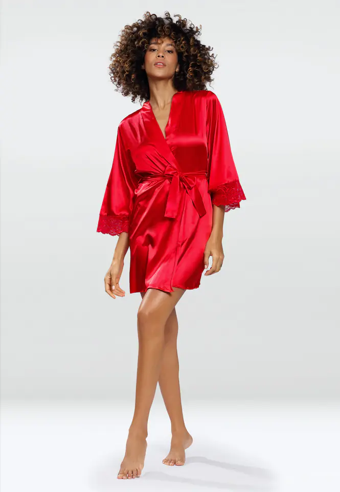 Belinda - zjawiskowy, cienki szlafrok, w którym ozdobisz swoje ciało niczym prawdziwa bogini... Wykonany z tkaniny najwyższej jakości, o subtelnym, perłowym blasku, emanuje pięknem i wdziękiem. Rękawy o modnej długości 3/4, wykończone ekskluzywną koronką. W talii wiązanie. Świetny pomysł również na elegancki prezent. Produkt pakowany w pudełeczko. Skład: 100% poliester.