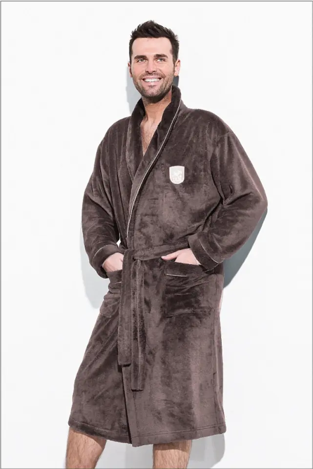 Ciepły i miękki szlafrok męski, wykonany z wysokiej jakości tkanin. Posiada kieszenie oraz wiązanie w pasie. Efektowny kołnierz zapewnia ciepło i ładnie komponuje się z całością. Posiada niewielki haft w okolicach piersi. Wykończony jasną lamówką. Dostępny w kilku wersjach kolorystycznych. Bardzo praktyczny i wygodny.