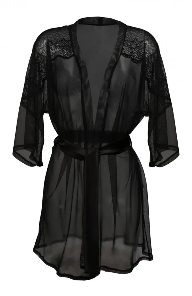 Zwiewny, ultra kobiecy szlafroczek typu peniuar. Wykonany z czarnego, elastycznego tiulu, z lekkością układa się na sylwetce. Koronkowe wstawki na ramionach, w pasie wiązanie za pomocą paseczka wykonanego z czarnej satyny. Pełne piękno i wdzięk! Skład: 100% poliester.