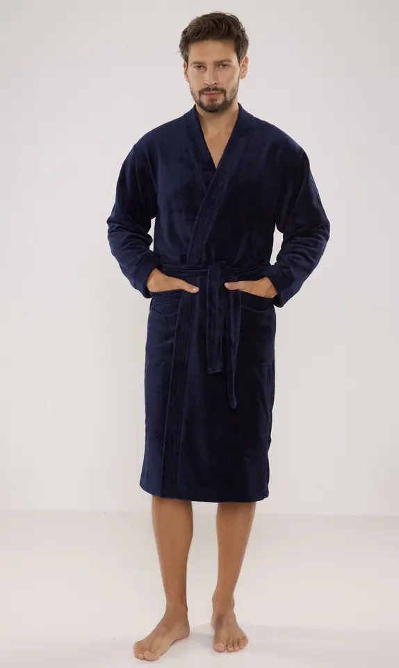 Wyjątkowo puszysty i ciepły szlafrok męski z kołnierzem, wiązany w pasie. Posiada wygodne kieszenie. Skład: 100% poliester.
