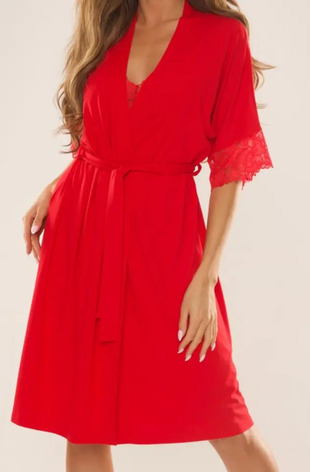 Szlafrok damski wykonany z wysokiej jakości wiskozy, krótki, wiązany w pasie. Krótki rękaw ozdobiony efektowną koronką. Skład: 94% wiskoza, 6% elastan.