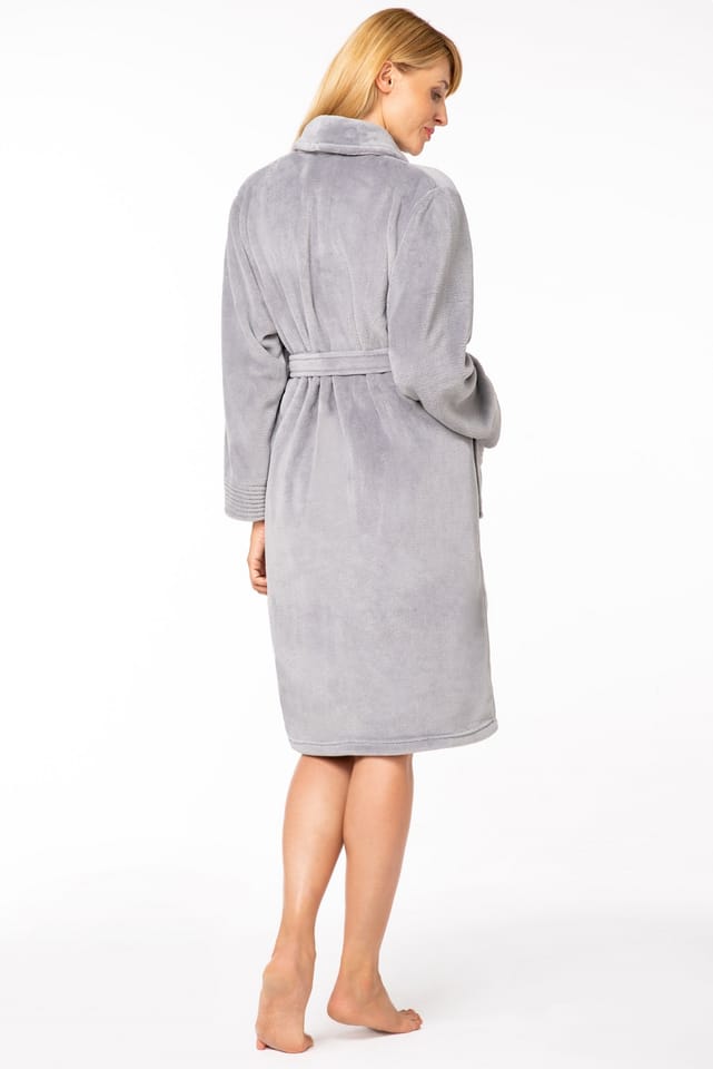 Klasyczny, wygodny szlafrok damski wykonany z przyjemnego, niepilingującego się materiału. Model posiada szalowy kołnierz, kieszenie i wiązanie w pasie. Długość za kolano. Skład: 100% poliester.