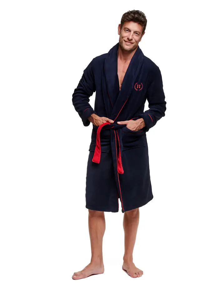 Ekskluzywny szlafrok z szalowym kołnierzem, marki Henderson. Wyjątkowo miękki i prawdziwie męski. Kolor ciemnogranatowy, (typu navy), zdobiony czerwoną lamówką. Na piersi wyhaftowana litera 'H". Biodra z kieszeniami, w pasie wiązanie. Bardzo dobra jakość. Idealna propozycja także na prezent. Skład: 100% poliester.