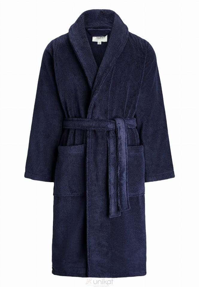 Męski szlafrok z szalowym kołnierzem, wiązany w pasie.