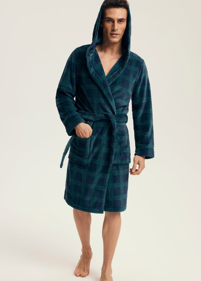 Szlafrok męski z kapturem i wygodnymi kieszeniami po bokach, wykonany z miękkiego i delikatnego materiału w kratę, który idealnie sprawdzi się do chodzenia po domu jak i po kąpieli. Klasyczny fason z wiązaniem w pasie. Skład: 100% poliester.