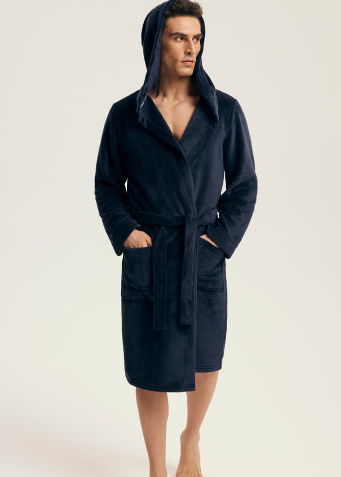 Szlafrok męski z kapturem i wygodnymi kieszeniami po bokach, wykonany z miękkiego i delikatnego jednolitego materiału, który idealnie sprawdzi się do chodzenia po do domu jak i po kąpieli. Klasyczny fason z wiązaniem w pasie. Skład: 100% poliester.