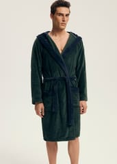 Szlafrok męski z kapturem i wygodnymi kieszeniami po bokach, wykonany z miękkiego i delikatnego materiału, który idealnie sprawdzi się do chodzenia po do domu jak i po kąpieli. Klasyczny fason z wiązaniem w pasie. Skład: 100% poliester.