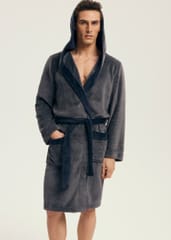Szlafrok męski z kapturem i wygodnymi kieszeniami po bokach, wykonany z miękkiego i delikatnego materiału, który idealnie sprawdzi się do chodzenia po do domu jak i po kąpieli. Klasyczny fason z wiązaniem w pasie. Skład: 100% poliester.