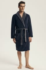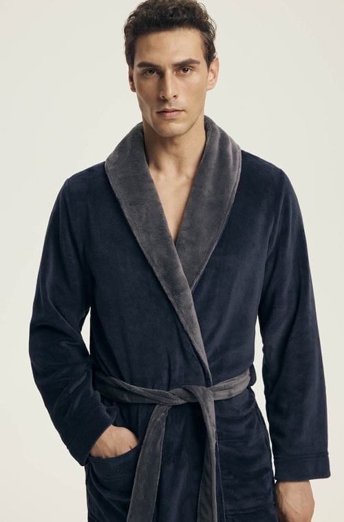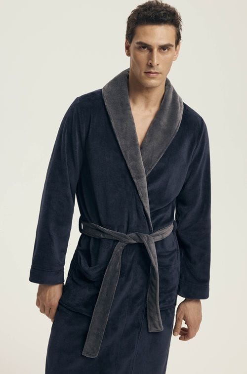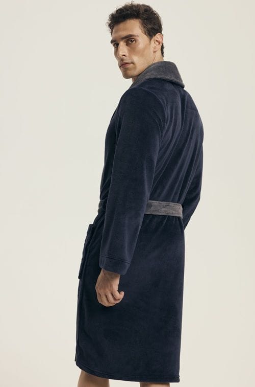 Szlafrok męski z kołnierzem i wygodnymii kieszeniami po bokach, wykonany z miękkiego i delikatnego materiału, który idealnie sprawdzi się do chodzenia po do domu jak i po kąpieli. Klasyczny fason z wiązaniem w pasie. Skład: 100% poliester.