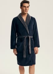 Szlafrok męski z kołnierzem i wygodnymii kieszeniami po bokach, wykonany z miękkiego i delikatnego materiału, który idealnie sprawdzi się do chodzenia po do domu jak i po kąpieli. Klasyczny fason z wiązaniem w pasie. Skład: 100% poliester.