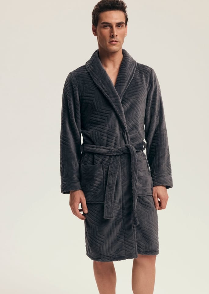 Szlafrok męski z kołnierzem i wygodnymii kieszeniami po bokach, wykonany z miękkiego i delikatnego materiału we wzory, który idealnie sprawdzi się do chodzenia po do domu jak i po kąpieli. Klasyczny fason z wiązaniem w pasie. Skład: 100% poliester.